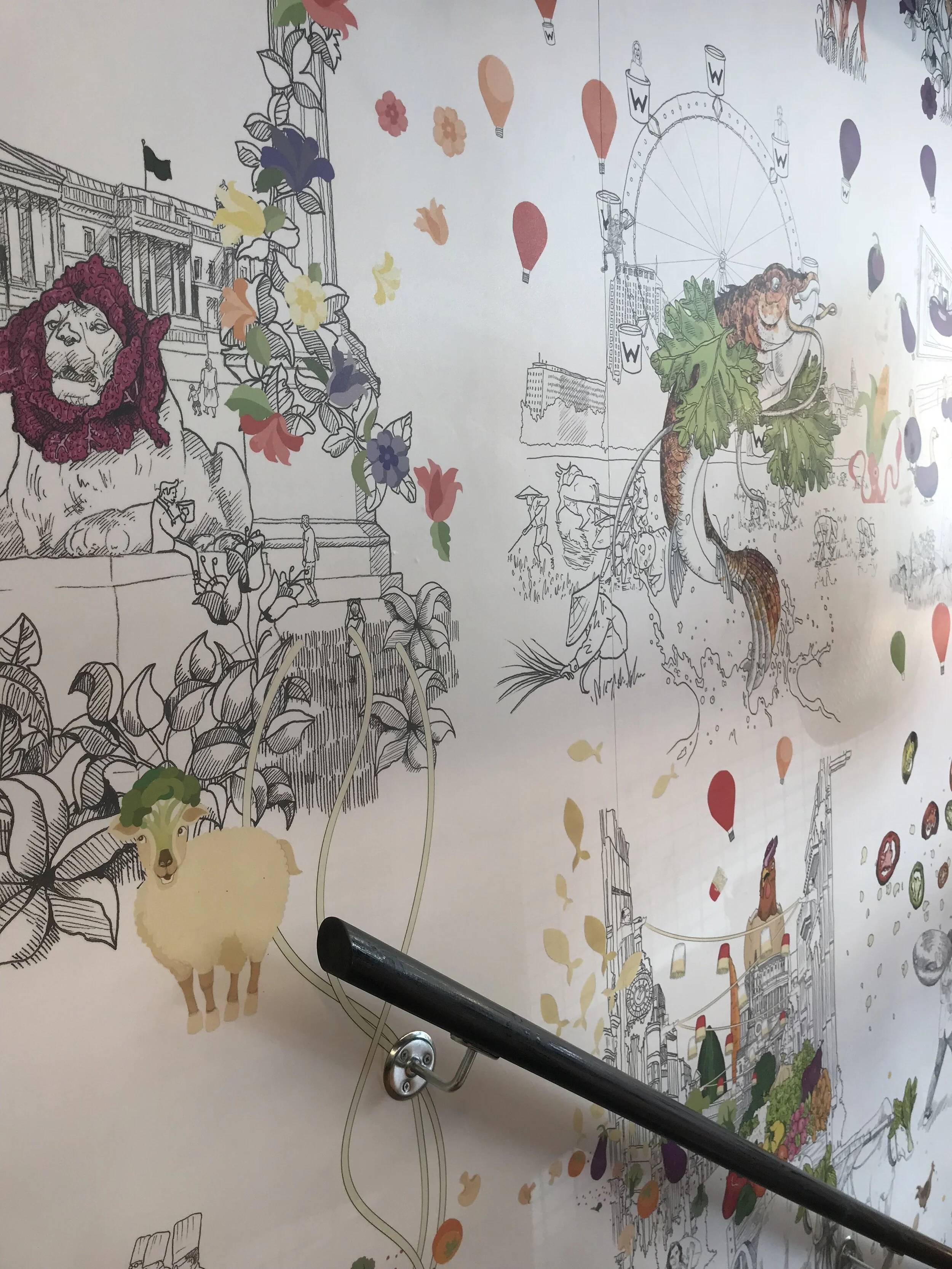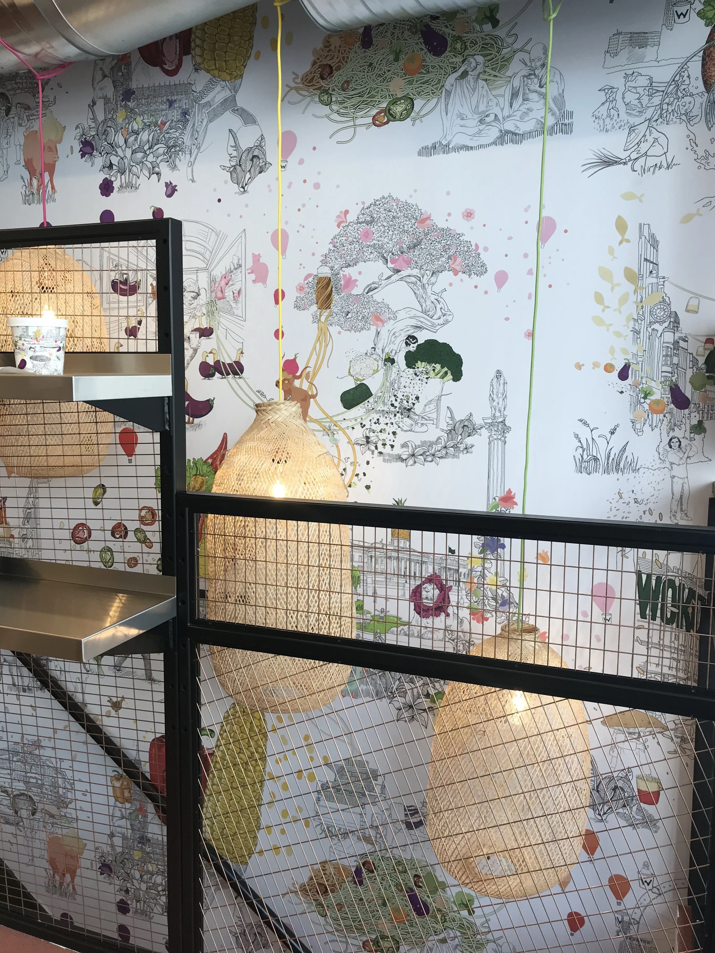 Commission by restaurant chain Wokit to illustrate two unique murals for two of their London locations, which was then applied as wallpaper as well as across packaging, printed material and online. Individual elements drawn in fineliner on paper and then combined and coloured digitally in Photoshop.